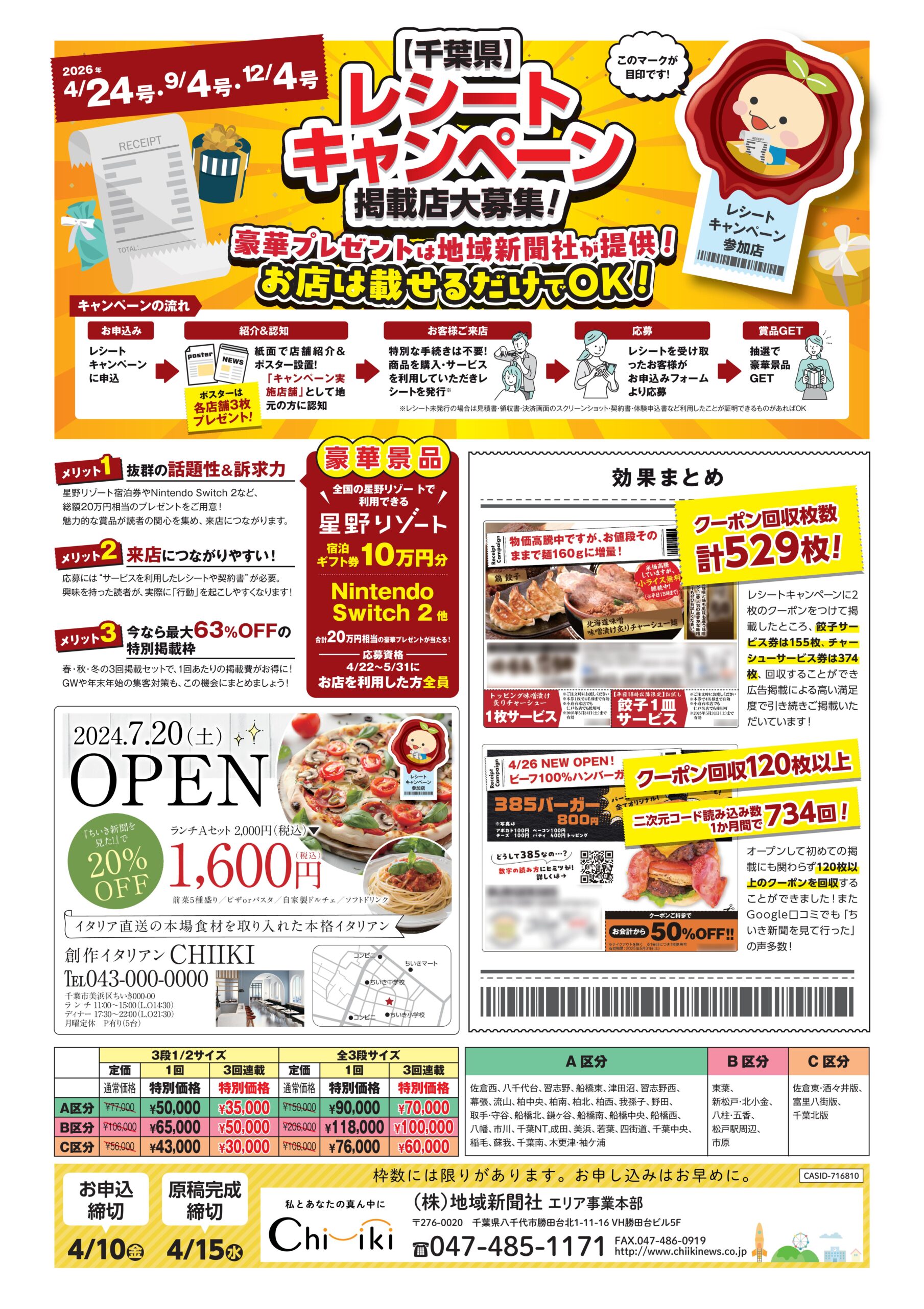 千葉県を中心に発行している地域での集客をお考えの方におすすめのフリーペーパー「ちいき新聞」の特集です。 2026年4月24日号は 【千葉県】レシートキャンペーン 「お店に行く&サービスを利用する」が条件になるレシートキ…