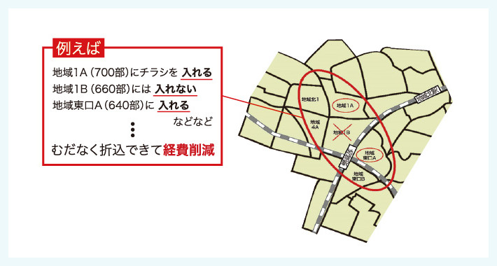 例えば 地域1A(700部)にチラシを入れる 地域1B(660部)には入れない 地域東□A(640部)に入れる などなど むだなく折込できて経費削減