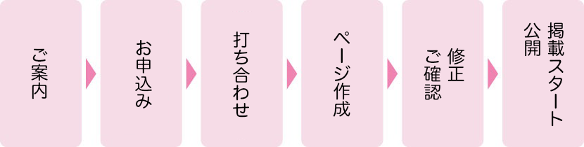 ご案内→お申込み→打ち合わせ→ページ作成→修正・ご確認→掲載スタート・公開